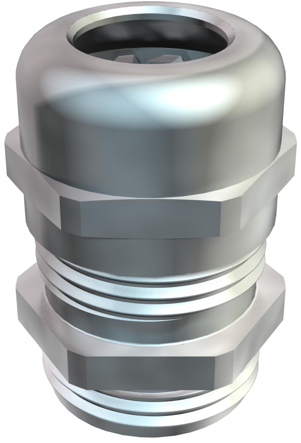 Kabelverschraubung in Hutmutterbauart mit großem Dichtbereich sowie Zugentlastung und Verdrehschutz für hohe Dichtigkeitsansprüche, mit PG-Anschlussgewinde nach DIN 40430. Klemmeinsatz aus Polyamid, Dichtring aus Chloroprene-Nitrilkautschuk, mit vormontiertem O-Ring am Anschlussgewinde.